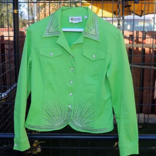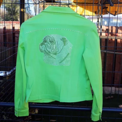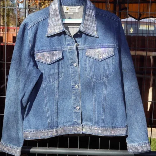 - Colorful Swarovski crystals and studs on the collar, and bottom of the jacket.
