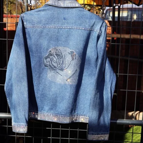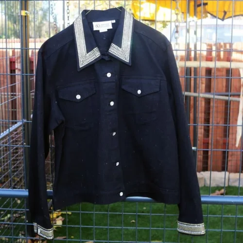 - Swarovski crystals and studs on the neck, and front pockets of the jacket.